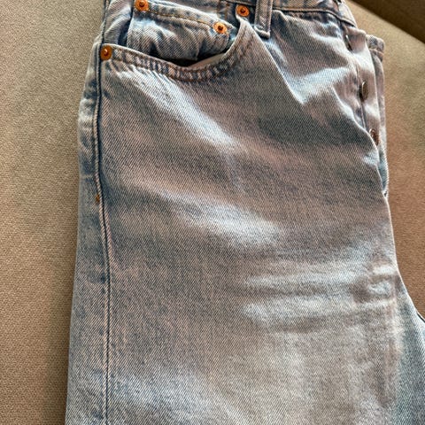 Levi's baggy dad jeans i svart farge, størrelse W26 for dame. Laget av bomullsmateriale. Jeansene har standard femlommers design og glidelås med knapp i front. Den er brukt, men har ingen tydelige merker eller flekker, og minimalt med rynker. Jeg synes selv den sitter noe løst i livet, så vil kanskje si at den er en W28 i realiteten da den er så relaxed