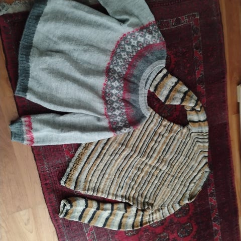 Hjemmestrikkede gensere. Passer til alder 8-10 år ca.