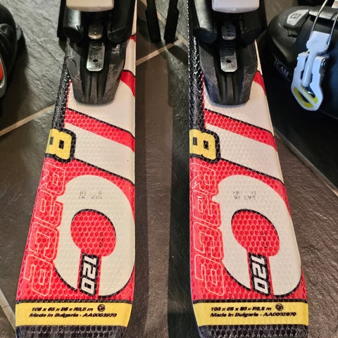Atomic Race S alpinski til barn, lengde 110 cm. Synlig brukt med noe rust på stålkantene. Gode ski, men trenger en runde prepping og sliping av stålkanter.