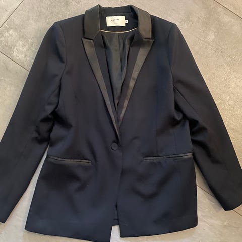 Munthe Cordfløyel dressjakke, dressbukse str 34 og vest i beige, størrelse S. Dressjakken har en knapp foran og to lommer med klaff. Vesten har knapper foran og justerbar belte på baksiden. Rette bukser .Materialet er cordfløyel, egnet for kvinner.