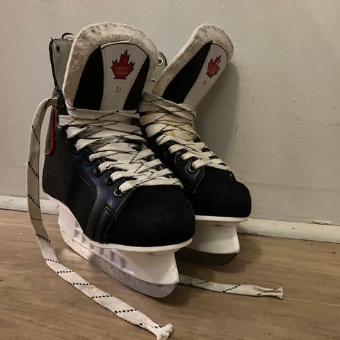 Tengelish Ishockeyskøyter for barn i størrelse 31, med blå og svart farge. Skøytene har justerbare remmer og polstret innside for komfort ved ishockeybruk.