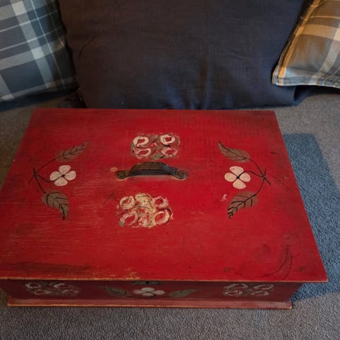 Håndmalt trekurv med lokk og håndtak i blå farge frå Viksdalen halve lokket kan opnast som vist på bilder.
