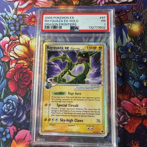 Dette er et klassisk Rayquaza-kort fra EX-æraen, en periode som er svært ettertraktet blant samlere på grunn av lavt opplag og høy alder.