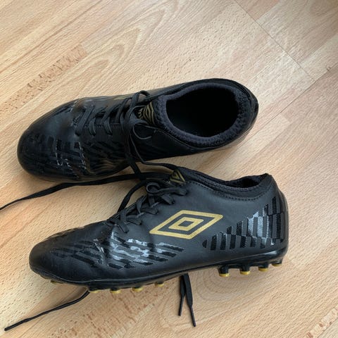 Umbro fotballsko i størrelse 38, svart farge og gull. Skoene har knotter for bedre grep på gressbaner og er laget i syntetisk materiale. Passer for bruk på fotballbanen.