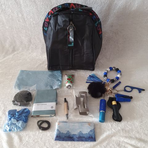 - safety nøkkelring sett bestående av: håndleddlenke, leppomade holder, hånddesinfeksjon beholder, pompom, setebelte kutter/glassknuser, multitool/døråpner/tastetrykker, korkåpner, sikkerhets fløyte/varsel fløyte