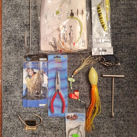 Selger samlet en pakke med en Sølvkroken dobbel takkelmappe, 20 fargerike gummiblekkspruter, selvlysende slange, fluoriserende slange, 20 selvlysende perler og noen små jigghaler. Alle disse er gode attraktorer for havfiske spesielt. Alt er nytt og ubrukt.