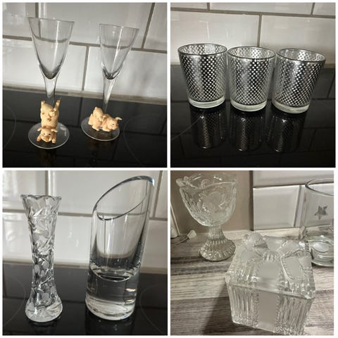 h:16cm b:10cm d:7cm. Farge hvitt og sølv. selges kr