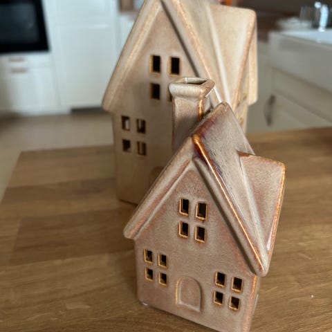 Flott glasert keramikkhus for telys eller lyslenke.