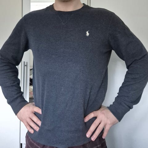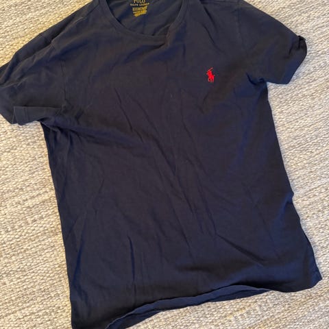 Ralph Lauren T-skjorte i størrelse S for menn. T-skjorten er blå og laget av bomull. Den har en enkel design med Ralph Laurens logo brodert på brystet. Det er en slitasje ved halsen, se siste bilde.
