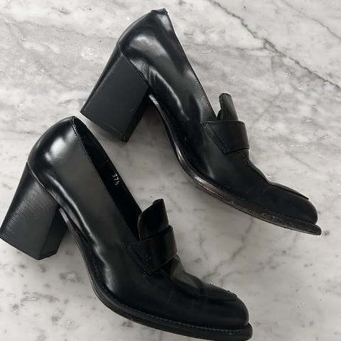 Et fint par med svarte sko, med gull hæl. Har noen bruksmerker foran, og nesten ingenting på sålene. De er veldig komfortable og pent brukte.