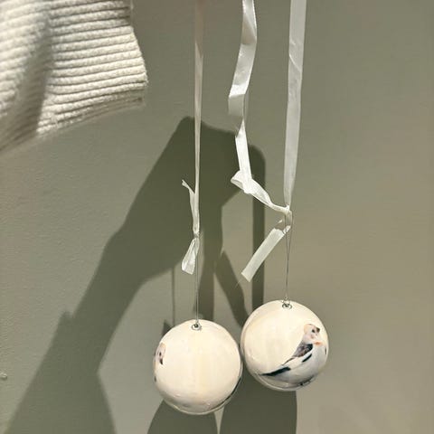 Aarikka dekorasjonsornament for bruk alle årstider. Ornamentet har en ramme med to blå fugler på en huske, samt et hjerte hengende i midten. Materialer inkluderer metall og tre, med blå sløyfebånd som dekorasjon. Den ene er litt solblekt