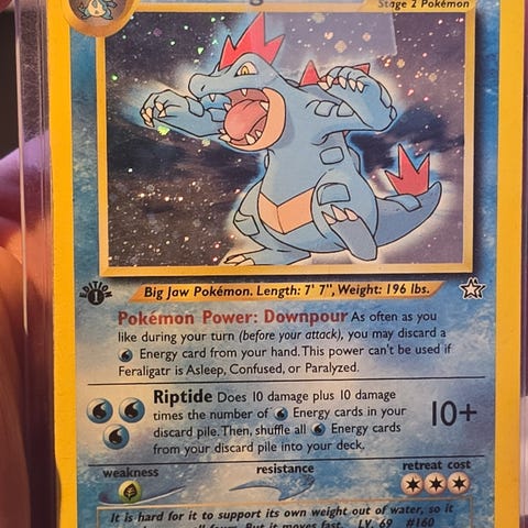 Pokémon Feraligatr samlekort med 180 HP. Kortet har evnen Torrential Heart som tillater å fjerne skadepoeng under visse betingelser, samt angrepet Giant Wave med 160 skadepoeng. Kortet er vann-type og illustrerer Feraligatr i en dynamisk positur.