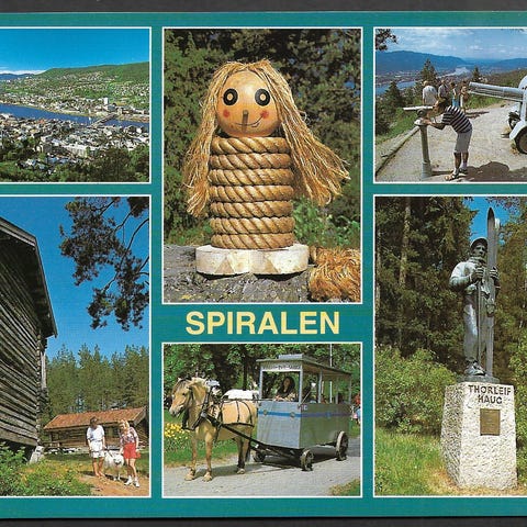 Spiralen Drammen postkort med flere bilder av spiralenområdet, inkludert bygninger, natur og folk. Strøkent, ubrukt A6-format. Se bilder