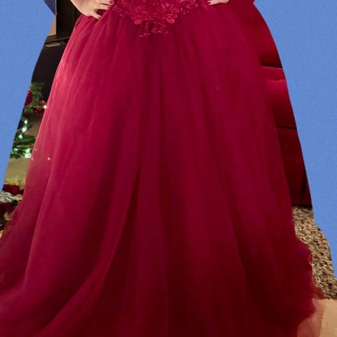 Grønn ballkjole til dame i størrelse XS-L. Hun på bildet er 170 lang. Kjolen har en stroppeløs overdel med dekorative detaljer og en lang, vid skjørtedel. Fremstår som ny da den kun er brukt til juleball