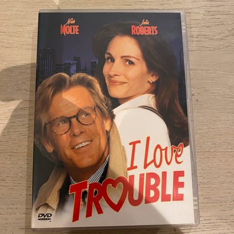 DVD-film med tittelen "I Love Trouble". Inneholder filmen med skuespillerne Julia Roberts og Nick Nolte. DVD-en er i standard størrelse og leveres i plastomslag. Norsk tekst.