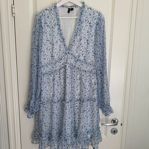 Kjole 1: Floyd penkjole i størrelse L, blå farge, laget av chiffon materiale. Kjolen har lange ermer og detaljer i blonder. Den har en nydelig folder ved midjen som gir kjolen en fin passform.