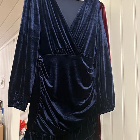 Kjole 2: Er av merket "By Kris of Norway", og er en vakker blå kjole med fine detaljer; både strassdetaljer og knyting bak på ryggen.