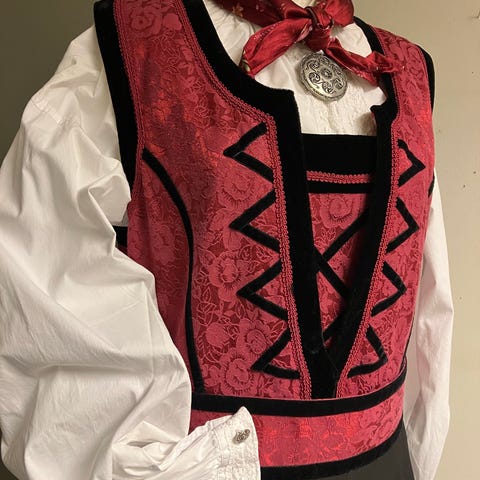 Kjolen er mørkeblå med dekorert bryst. Ermeløs, men har slep. Den har en splitt foran og en glidelås bak.