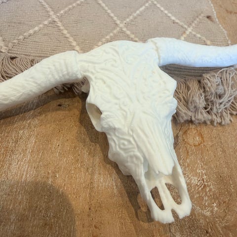 Dekorativ okseskalle svart med utskårne detaljer. Passer som veggdekor i ulike rom. Måler ca 50cm i bredde/70cm høyde.