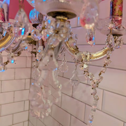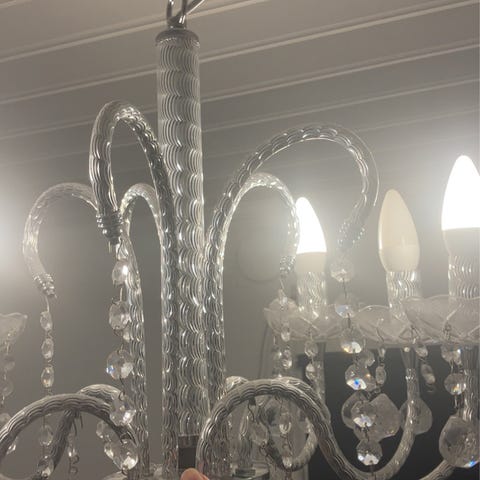 Lysekrone selges. Den er intakt, men plastikken rundt lyspærene har gulnet.