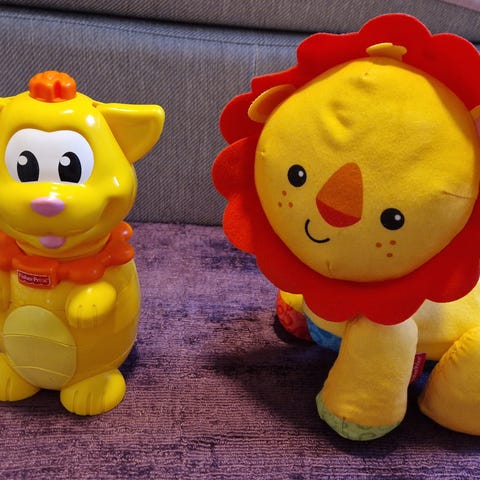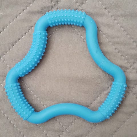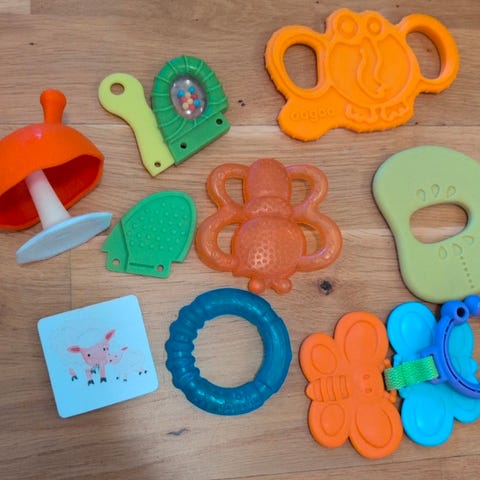 Sett med diverse babyprodukter, inkludert biteleker og silikonsmokker for når babyer begynner å spise.