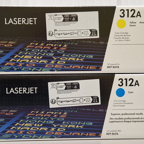 Ny original HP Blekkpatron til Hp laserskriver. Passer til HP LaserJet Pro MPF, M377, M452, M477. Har 2 gule og 1 rød. Selges stykkvis. Pris pr stk inkl mva. 1400 (pris hos Lyreco er 2290 pr stk).