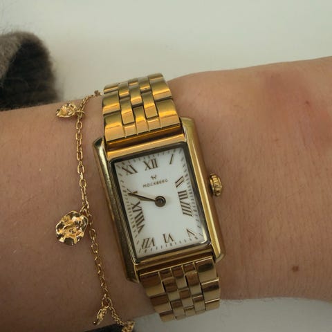 Mockberg dameklokke i gullfarget metall med rektangulært urskive og lenkearmbånd. Klokken har en klassisk design med romertall på urskiven.