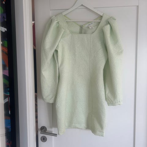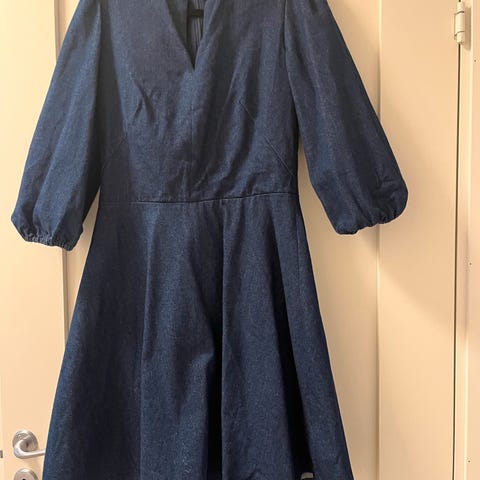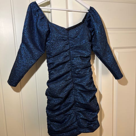 Flott Untold Stories festkjole i størrelse S, blå farge og laget av polyester, metalise og elastan. Kjolen har lange ermer og strukturert stoff, egnet for festlige anledninger