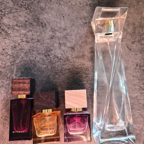 Flere parfymeflasker i ulike størrelser og design.