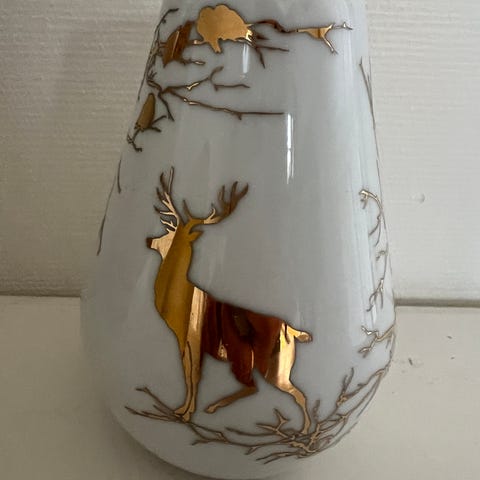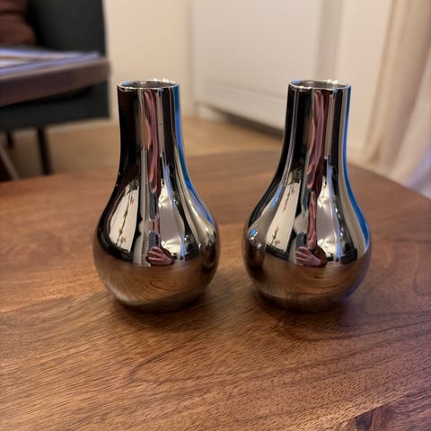 Lagd kun i et lite opplag, potselenvaser med sølvaktig glasur. Høyde 16 cm. Selges samlet. Ny pris pr stk var 599 kr per stk, prislappene sitter på. Selges for kr 475 for begge.