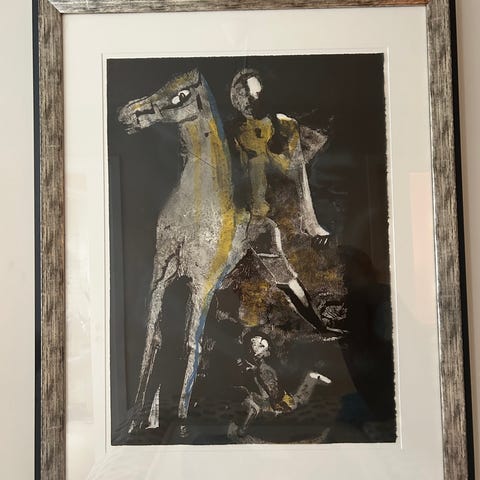 "Sand og stjerner" et litografi av den norske billedkunstneren Roald Wold (1926- 2001) fra 1983. Stilen er abstrakt med fokus på farger og former. Nummert 45/160 og signert i høyre hjørne. Profesjonelt innrammet i glass og hvit smal ramme. Mål: 66 x 52 cm. I meget god stand. Må hentes. Men kan sendes etter avtale.
