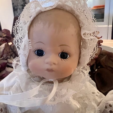 Samledukke med langt rødt hår og blå øyne iført en lang hvit kjole med blonder og tilhørende hette. Dukken har detaljerte ansiktstrekk og er kledd i et tradisjonelt, gammeldags antrekk.