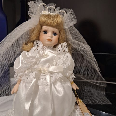 Porselen dukke med brudekjole, bryllup, 50 cm