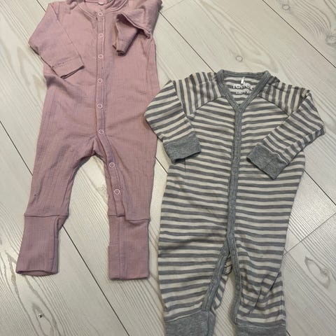 Tre pent brukte, myke og gode pysjer. To i merinoull (blå og rosa, Reflex) og en i bomull (mønstrete, Lilleba). Størrelse 56.