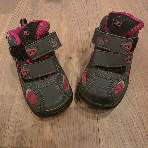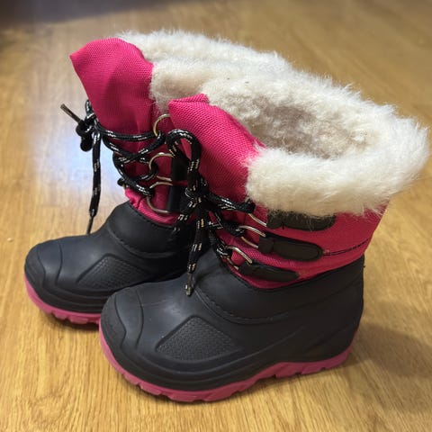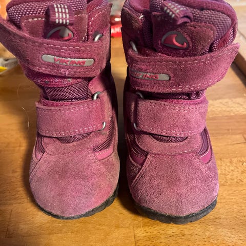 Barnestøvler i størrelse 22, designet for jenter. Støvlene har lilla farge og er utstyrt med borrelås for enkel justering. Egnet for bruk i kaldt vær med isolerende materiale og solid såle for godt grep.