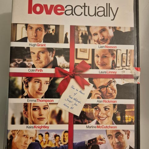 Love Actually DVD med romantisk komedieinnhold. Inneholder filmen Love Actually med flere kjente skuespillere og bonusmateriale.