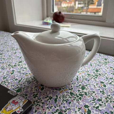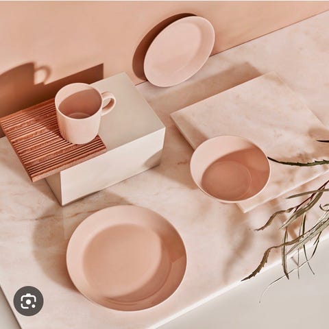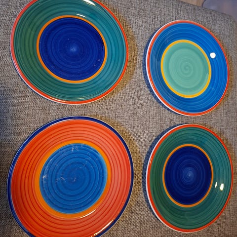 Iittala tallerken- og koppesett i keramikk med oransje og gul farge. Settet inkluderer flere tallerkener og kopper, egnet for servering av mat og drikke.liten skade på en talkerken syntes lite.