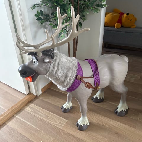 Reinsdyr fra Frost som fortsatt lager lyder. Har liten flekk på ryggen ellers fin og moro å bruke. Små barn kan sitte på og holde seg horna eller sal. En liten plass gulrot føler med.