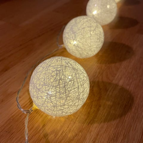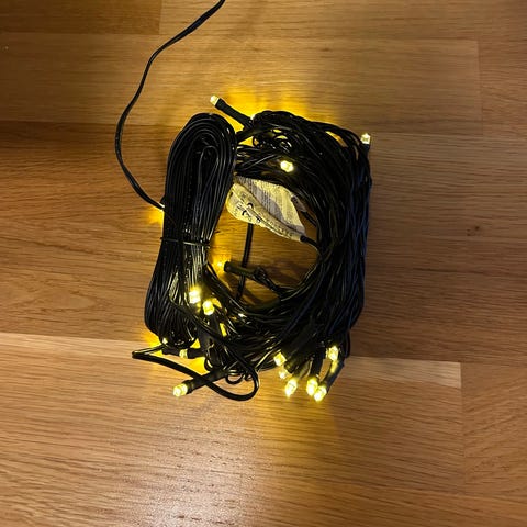 13 meter lang lyslenke med røde små kuler. Den har forskjellige funksjoner. Blinker står stille osv. Selges for 200kr.
