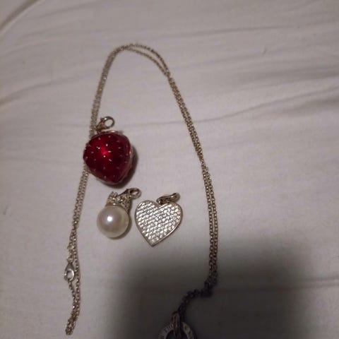 Pent hjertesmykke med krystaller , kjedet er ca 40 cm langt. Smykket er bare blitt prøvd og liggende ubrukt.