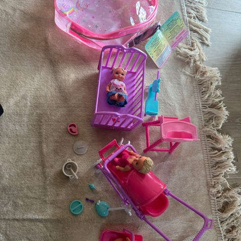 Dukkevogn og bilsete i rosa farge. Dukkevognen har justerbart håndtak og fire hjul. Bilsetet er designet for dukker og har rosa håndtak. Passer til lek med dukker. Vognposen i dukkevognen følger med. Liten skade på håndtak som vist på bildet. Må hentes.