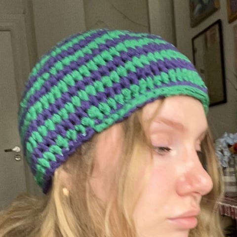 Heklet kattelue med ribbkant. Laget i rent ull og har en del stretch, passer ca 52-60 cm hodeomkrets. Ullen er tykk og varm, har gitt flere i gave for 2 år siden og fått beskjed om at det er den varmeste lua de har hatt og den er fortsatt i god stand. Klar til levering.