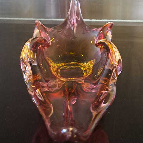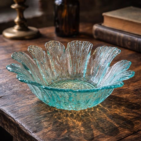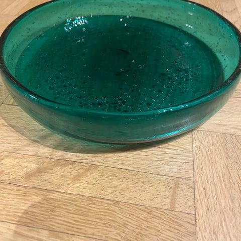 Designet og kvaliteten minner om finsk glass fra 1960–70-tallet, og fatet er tilskrevet Humppila – kjent for sitt karakteristiske pressglass og organiske former.
