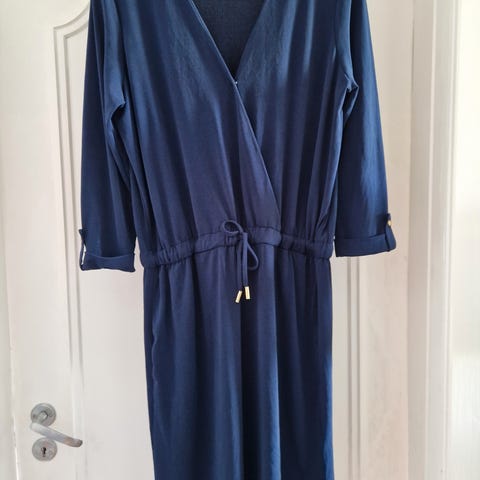 Super fin blå farge, type cord stoff. Knyting i livet.