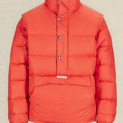 Midjeskåret tykk resirkulert dun anorakk i økologisk bomull. Avtakbare ermer for solskinnsdagene i løypa.