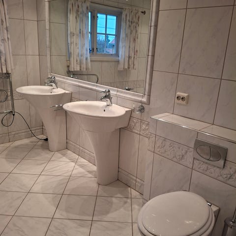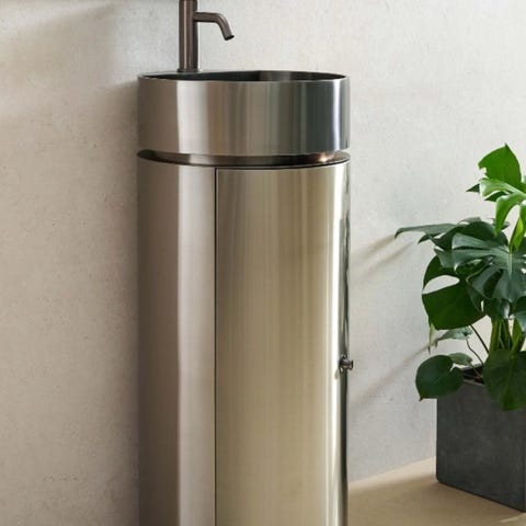 Søyleservant i stål med glasstopp selges. Pent brukt, ingen skader. Festes med to små braketter i vegg. Kan i tillegg skrues eller limes fast i gulvet. Ferdig festet kran og bunnventil med propp følger med. Tror alle deler kan tas fra hverandre.