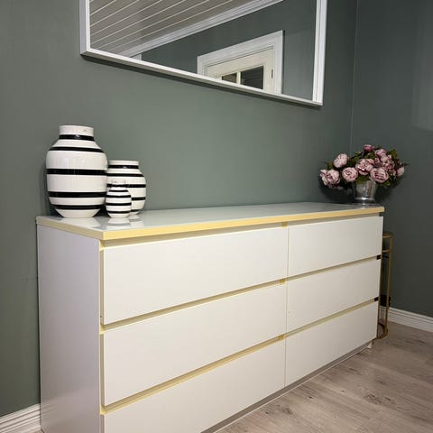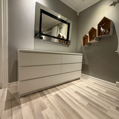 IKEA Malm kommode med både speil og plass til oppbevaring av smykker på toppen. Det er to smale skuffer øverst og 4 større nederst.