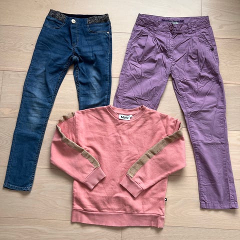 H&M klespakke med t-skjorte fra Kenzo. Super Soft jeans for jenter i størrelse 128. Jeansene er blå og laget av bomull. To andre bukser og gensere. Designet for komfort og passform til barn.