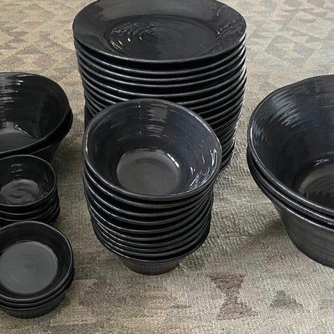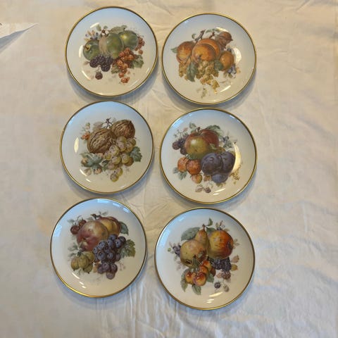 På tekanne har det gått av et skår oppe på kanten, som vist på bildet, ellers er kopper og skåler fine.