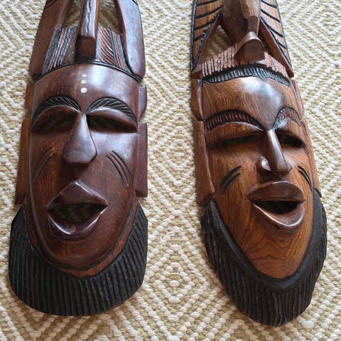Sett med fire afrikanske håndlagde masker laget av tre og dekorert med fjær. Maskene varierer i størrelse og design, og kan brukes til dekorasjon eller kulturelle formål.